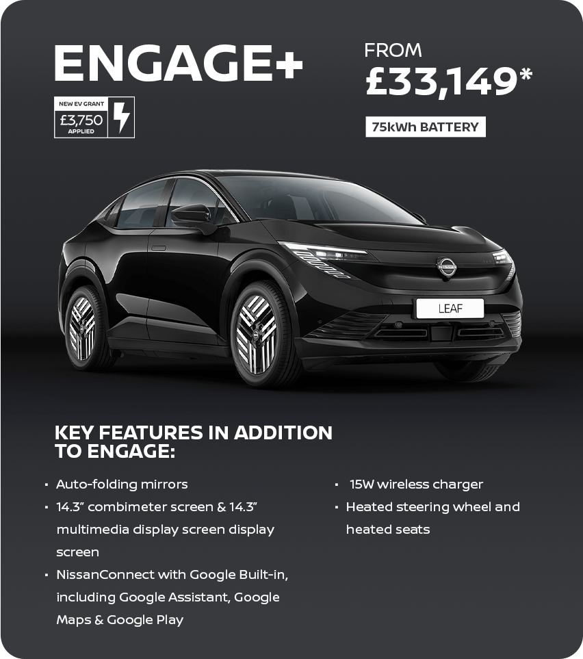 (1) Figure shown is indicative and shown for comparability purposes only. 386 miles range refers to the LEAF 75 kWh Engage on a WLTP Combined Cycle. All derivatives are fully homologated against the standards of the Worldwide Light Vehicle Test Procedure (WLTP). Actual real-world driving results may vary depending on factors including the starting charge of the battery, accessories fitted after registration, weather conditions, driving styles and vehicle load. Range quoted is based on 100% starting state of charge.