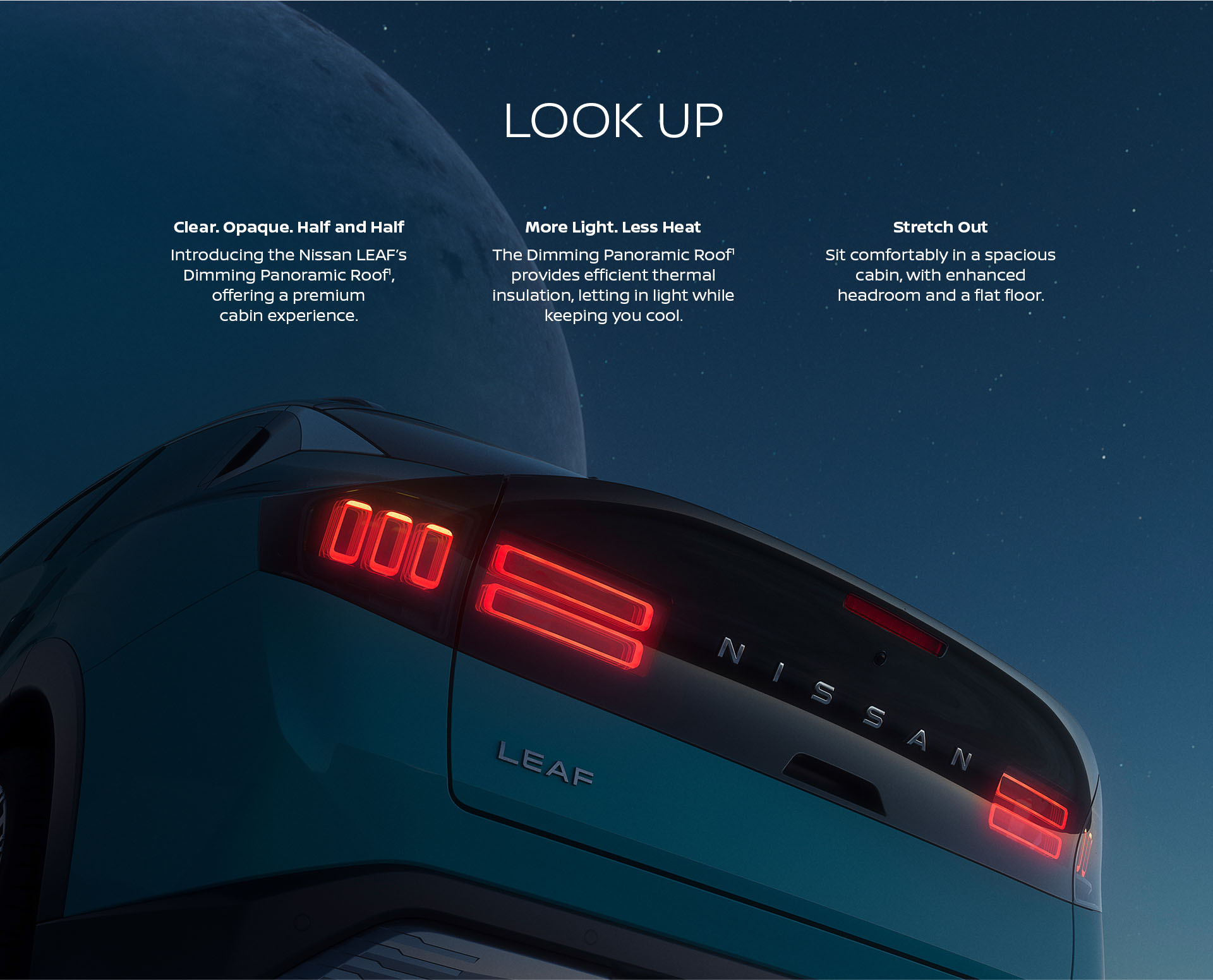 Go further with the all-new Nissan LEAF, the perfect electric compact car with innovative technology. Designed with aerodynamic lines that effortlessly cut through the air. The electric LEAF’s bold new design is elevated by striking rear lights inspired by Nissan’s Japanese heritage, featuring a distinctive light signature that spells “Nissan” in Japanese.